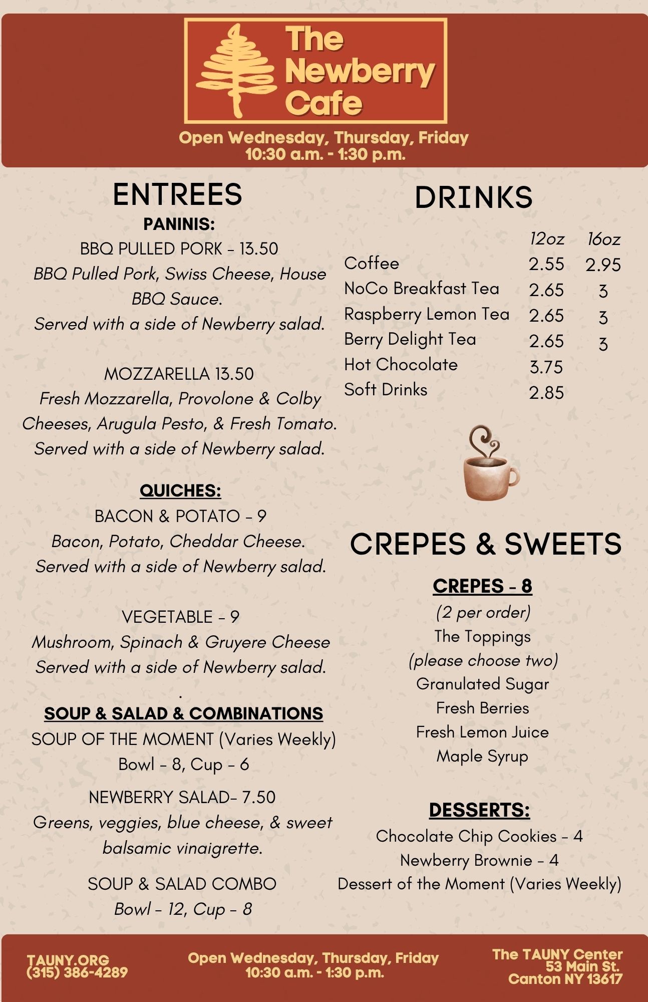 New Hours: As of Wednesday, April 1st: Wednesday, Thursday & Friday 10:30 a.m. – 1:30 p.m.